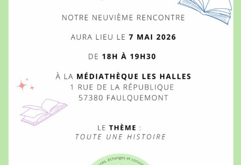 L’agenda 02 mai 2026 Bébés lecteurs Médiathèque Les HallesFaulquemont (57) 30 mai 2026 Bibliothèques en scène : Et si on se mettait à la musique… 06 juin 2026 Bébés lecteurs Médiathèque Les HallesFaulquemont (57) Les actualités de la médiathèque FERMETURE EXCEPTIONNELLELa médiathèque sera fermée exceptionnellement du vendredi 3 avril au lundi 6 avril 2026 inclus. Réouverture mardi 7 avril à … Lire la suite Lire la suiteLE PRINTEMPS DU DESSINLe grand rendez-vous du dessin contemporain du 20 mars au 21 juin 2026 ! Le dessin contemporain est à l’honneur … Lire la suite Lire la suite Catalogue Médias Production Mosel’Lire GS-CP – Ecole de Pontpierre 2024-2025Découvrir tous les médias