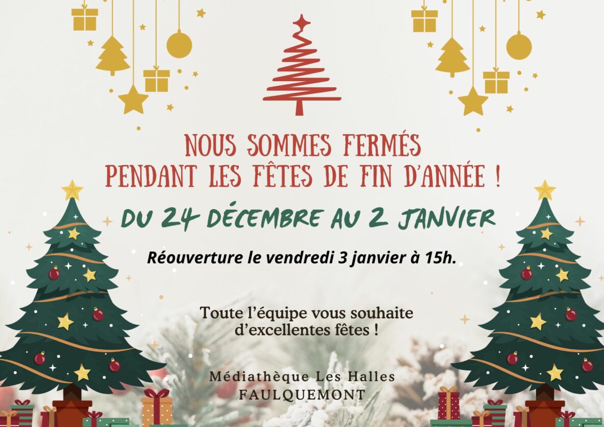 Fermeture exceptionnelle La médiathèque sera fermée du 24 décembre au 2 janvier 2025. Nous vous accueillerons à nouveau le vendredi 3 janvier à 15h. Toute l’équipe de la médiathèque vous souhaite de Joyeuses fêtes de fin d’année !
